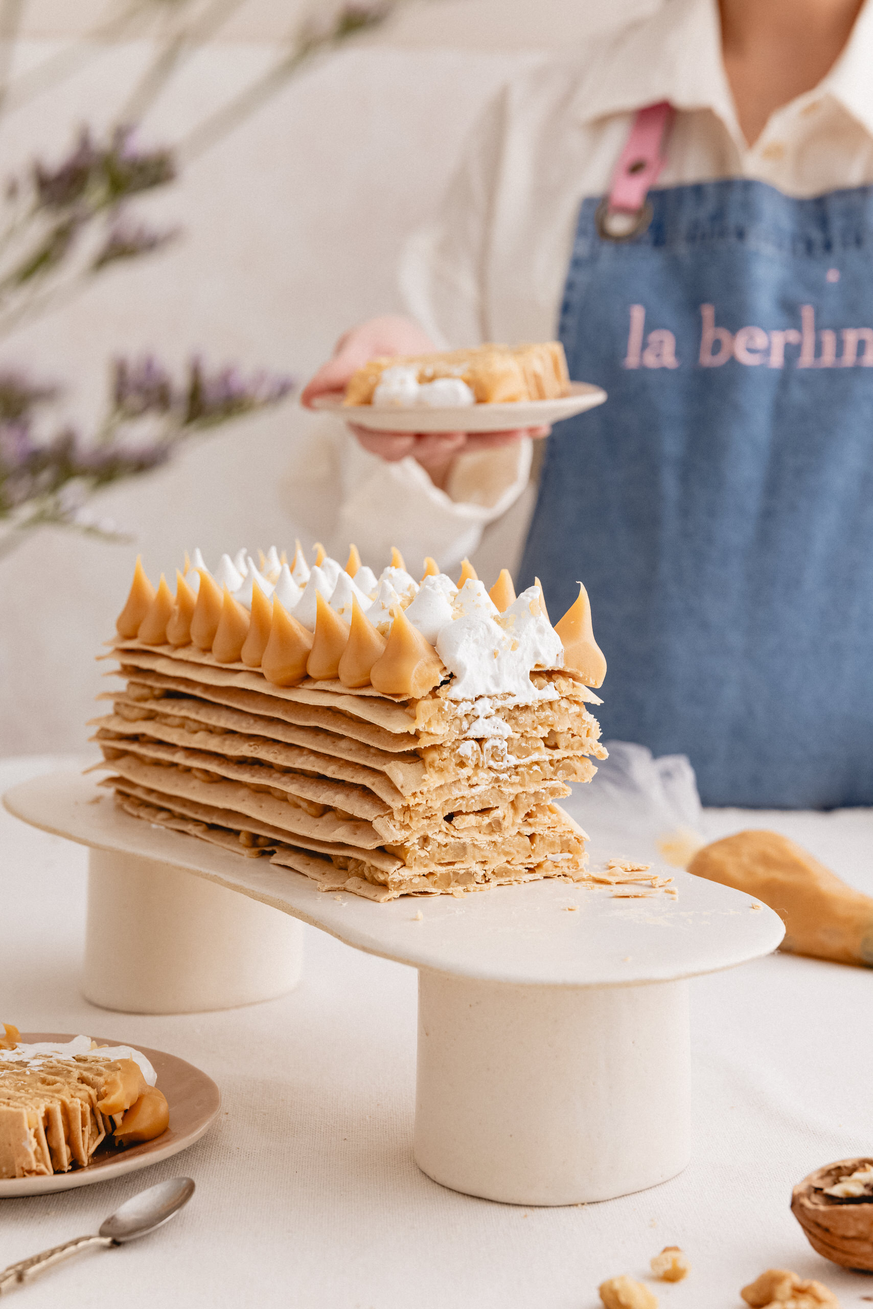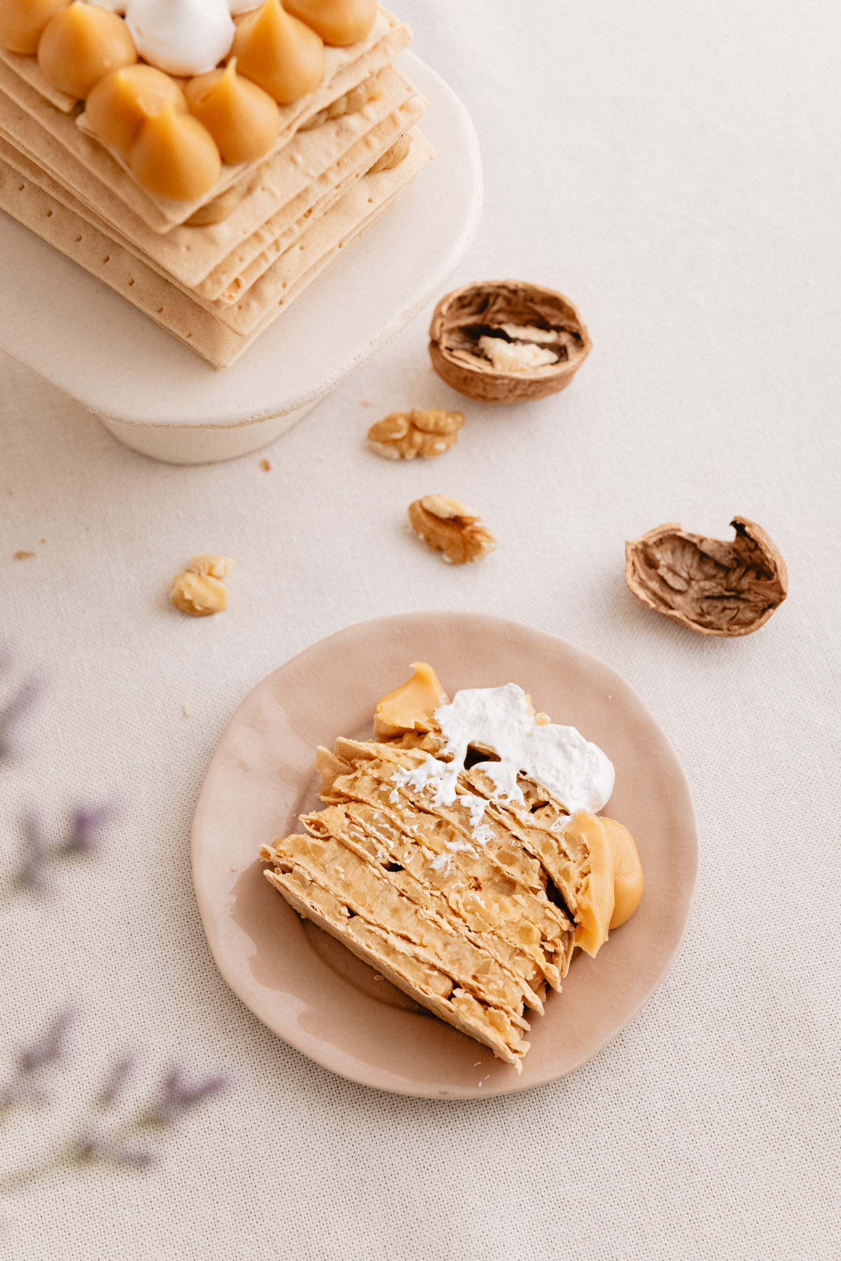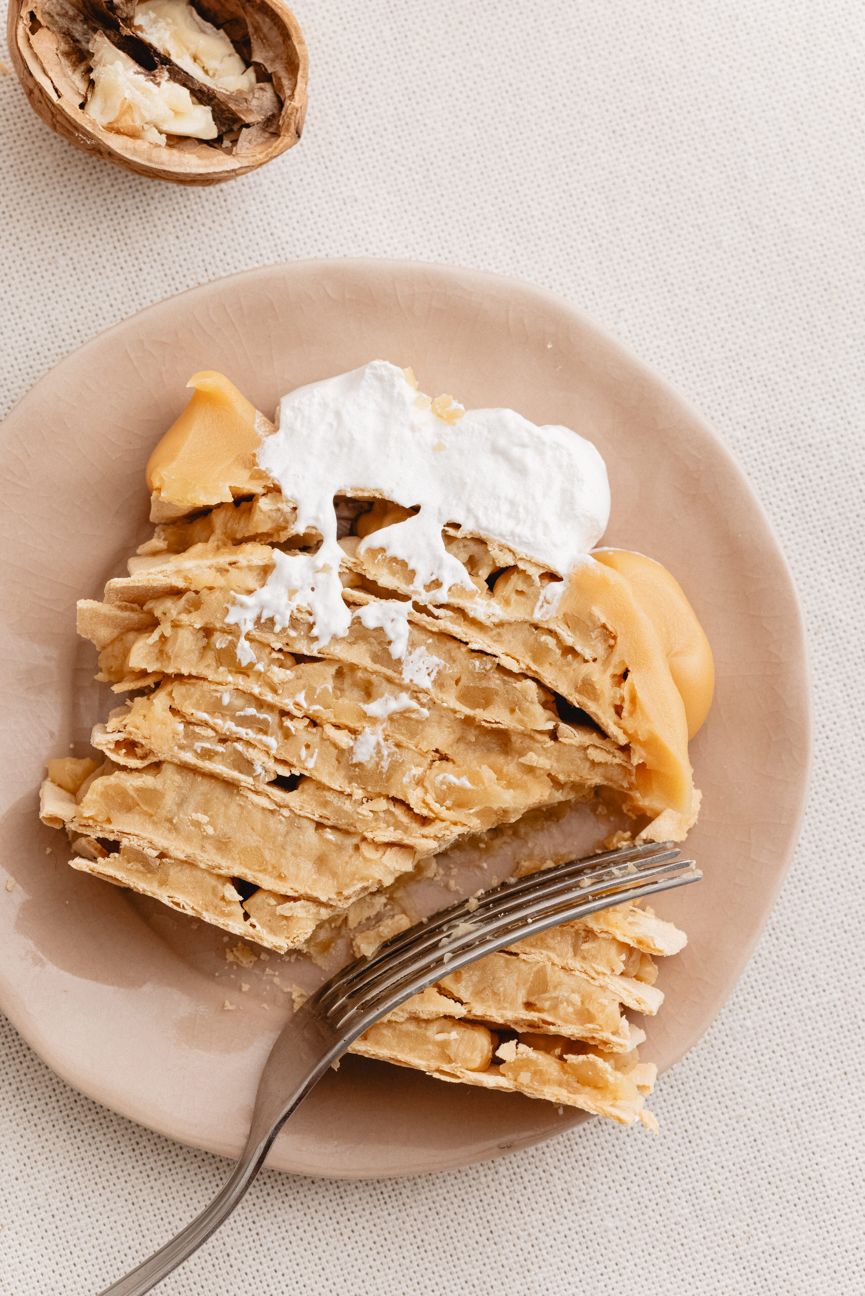 Capas de Hojarasca relleno de Manjar artesanal y nuez. Decorada con majar, merengue y nueces.