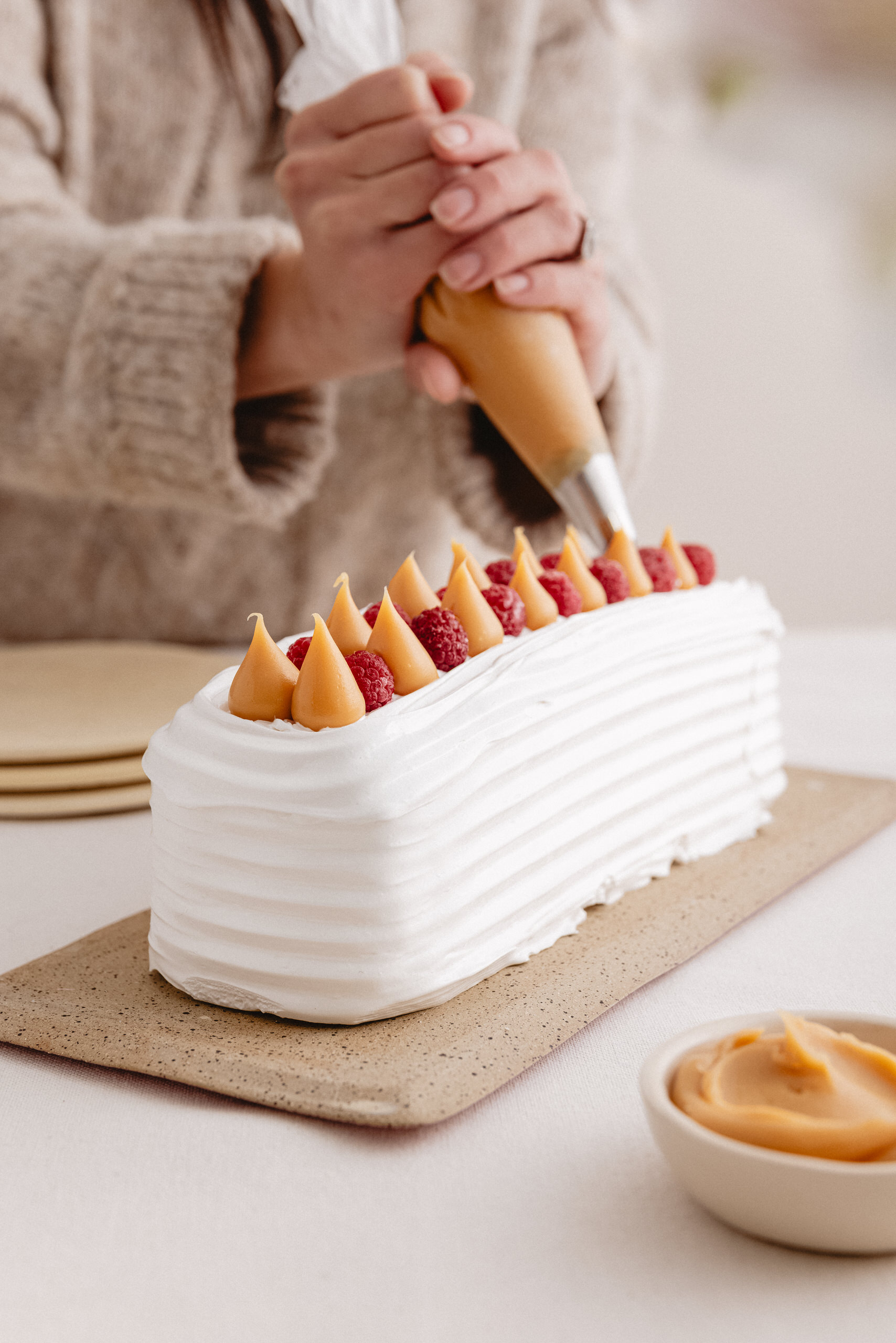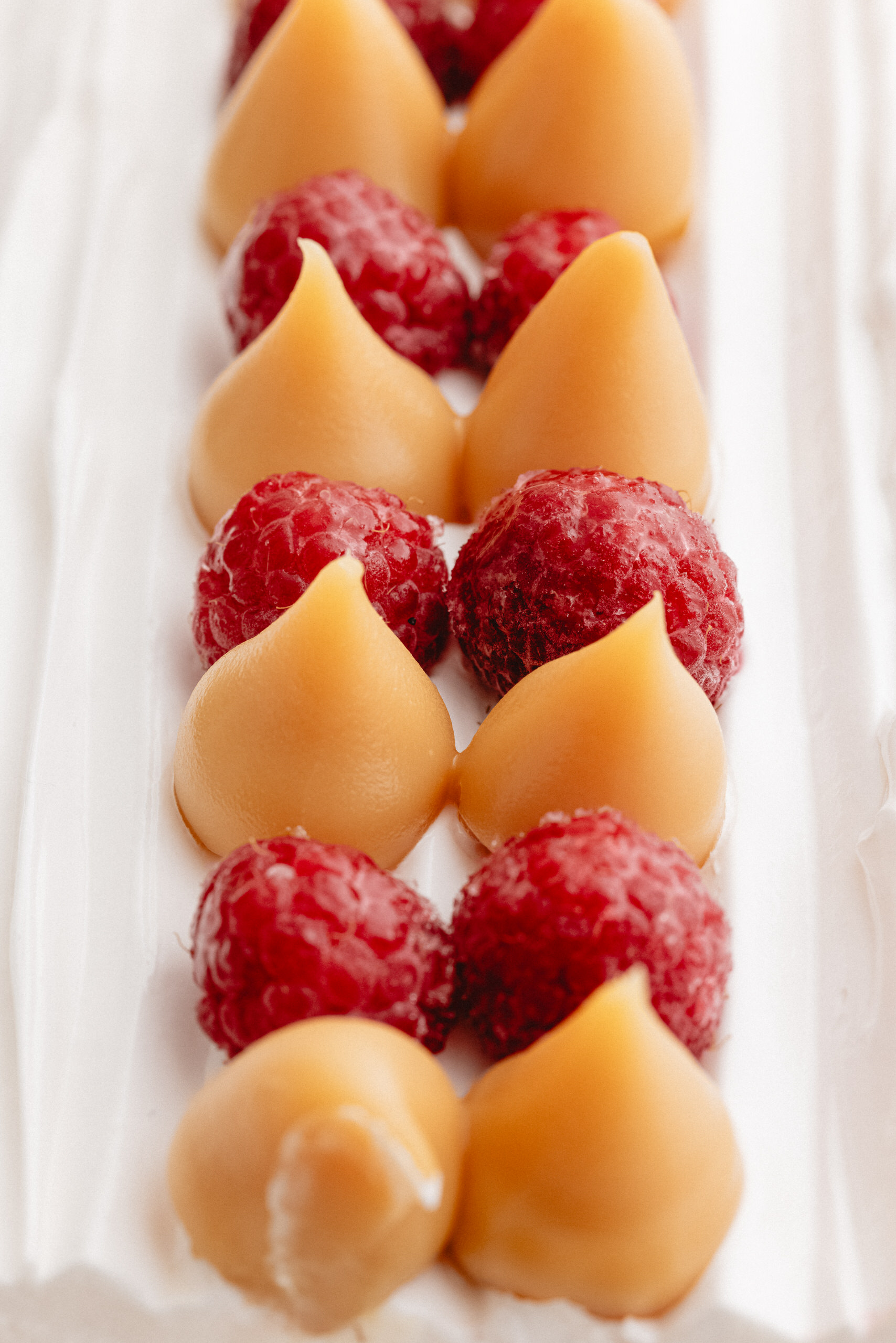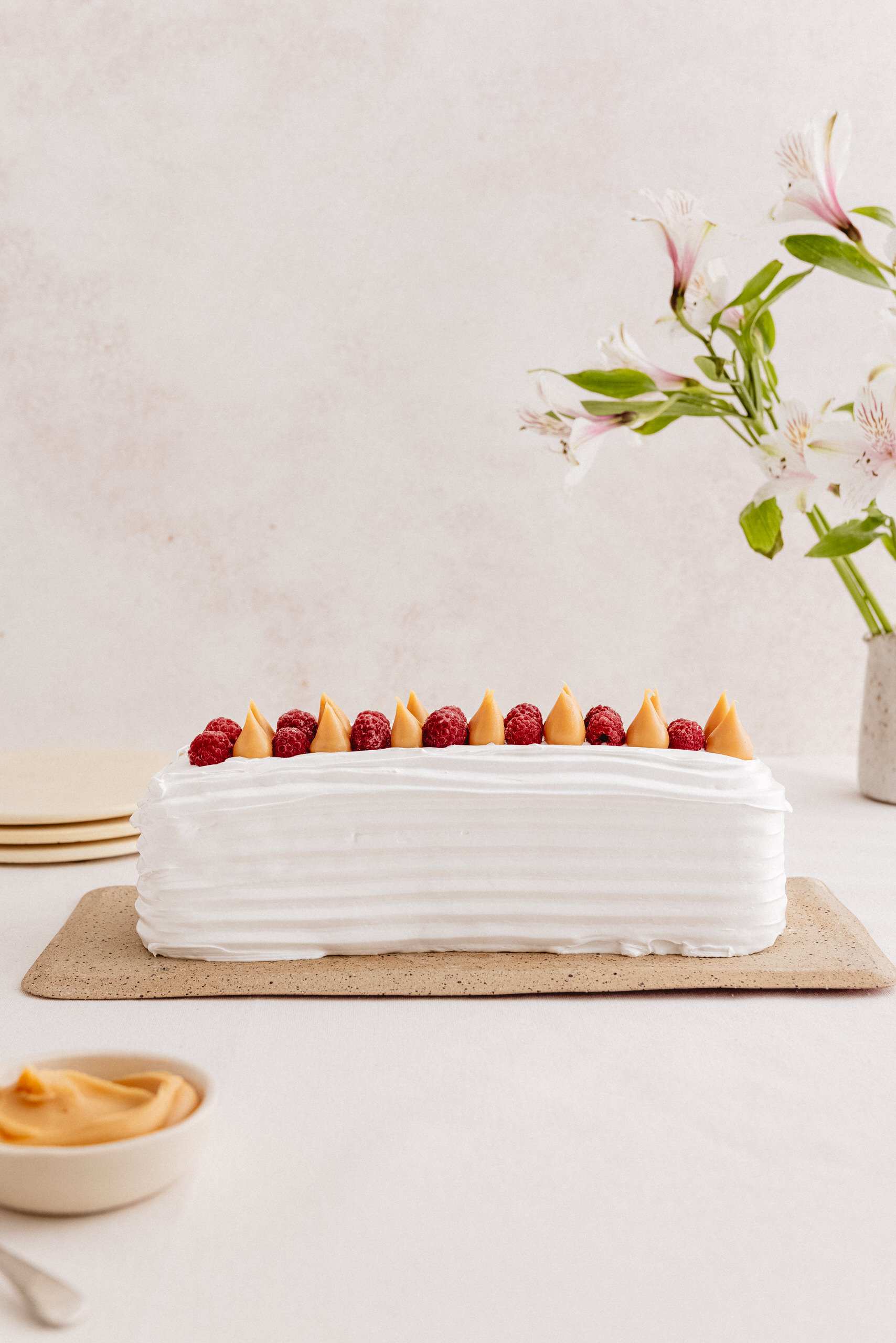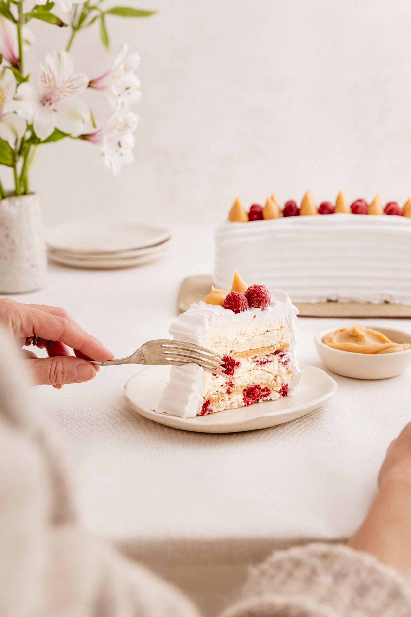 Merengue, Crema sin Lactosa, Frambuesas y Manjar Artesanal. Decirada con Merengue y Frambuesas