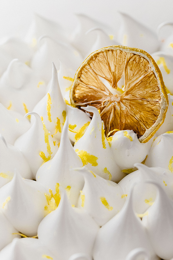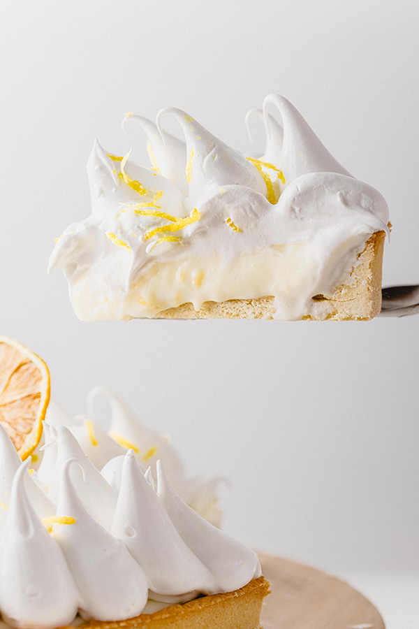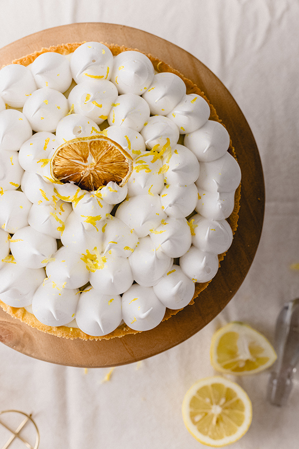 Masa de mantequilla, relleno leche condensada y limón natural. Decorado con merengue y Zeste de Limón.
