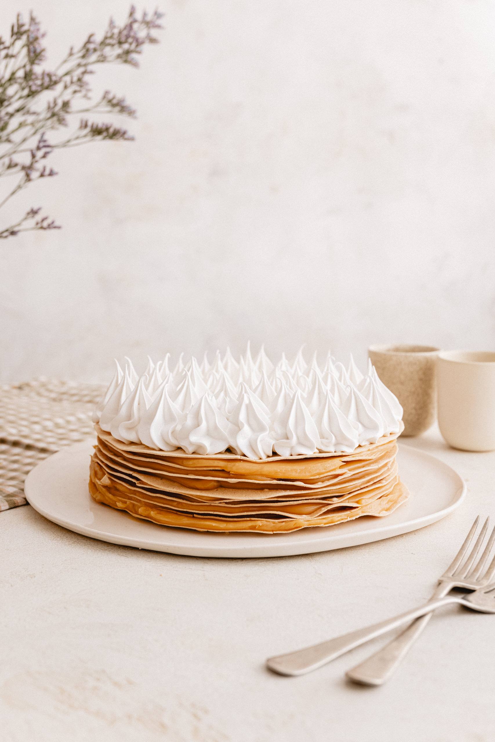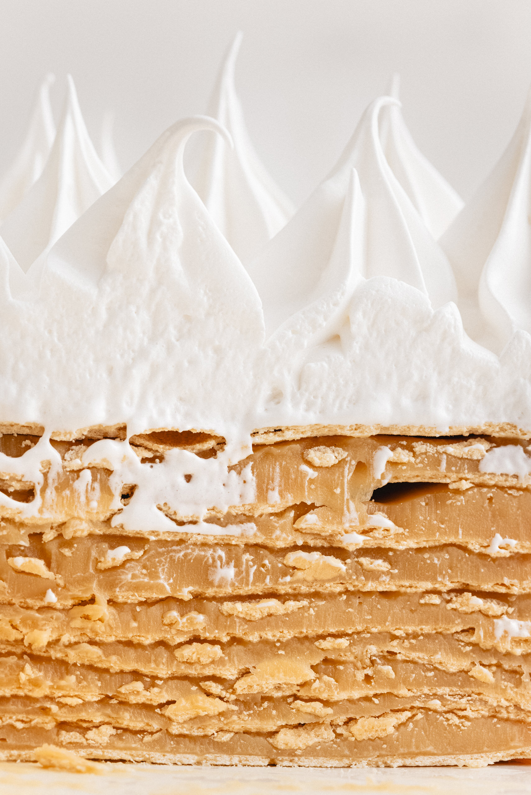 Discos de hojarasca, relleno de manjar artesanal. Decorado con merengue.
