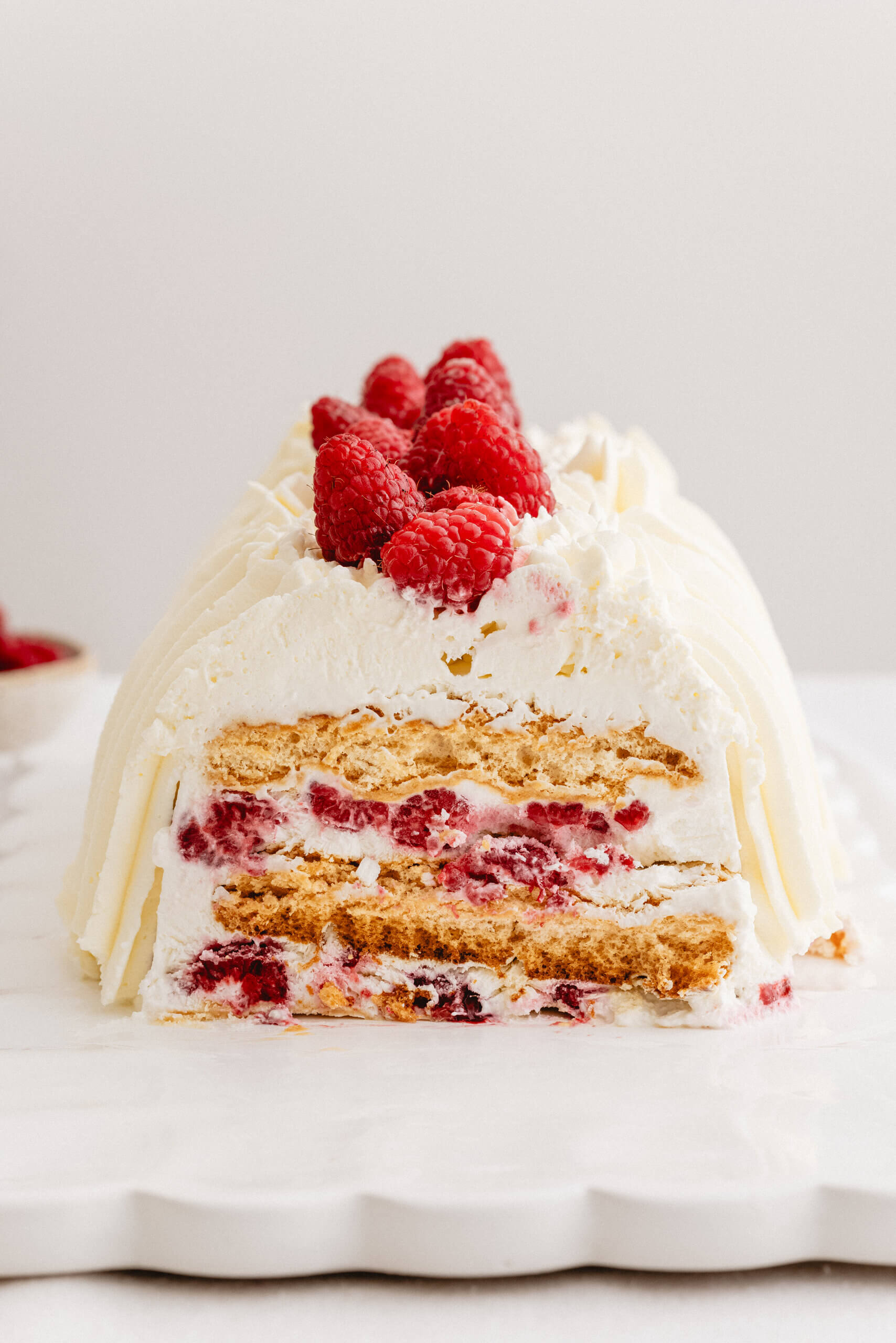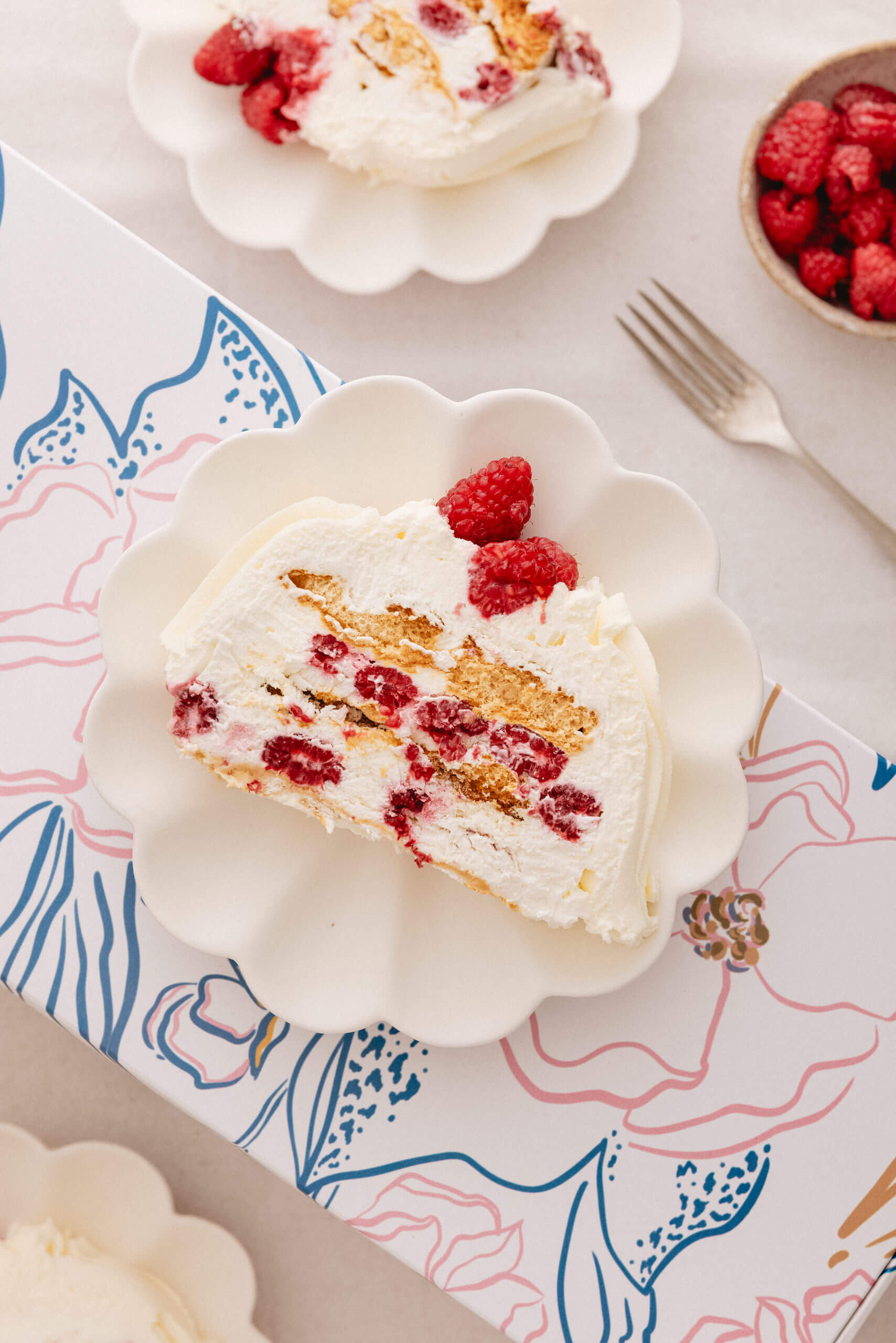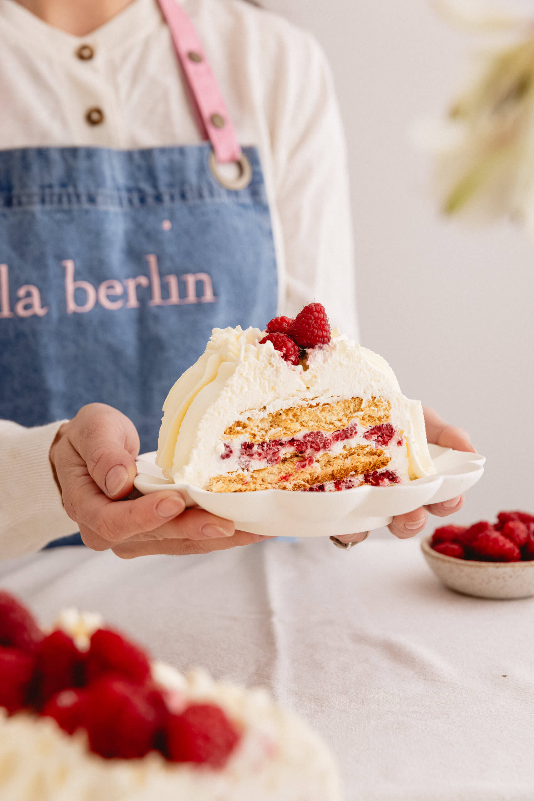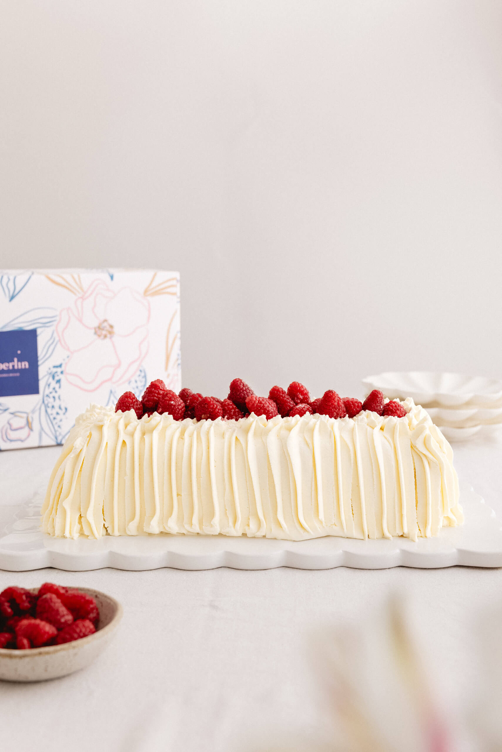 Merengue sin azúcar (Alulosa), relleno de crema sin lactosa y frambuesas. Decorado con crema sin lactosa y frambuesas.