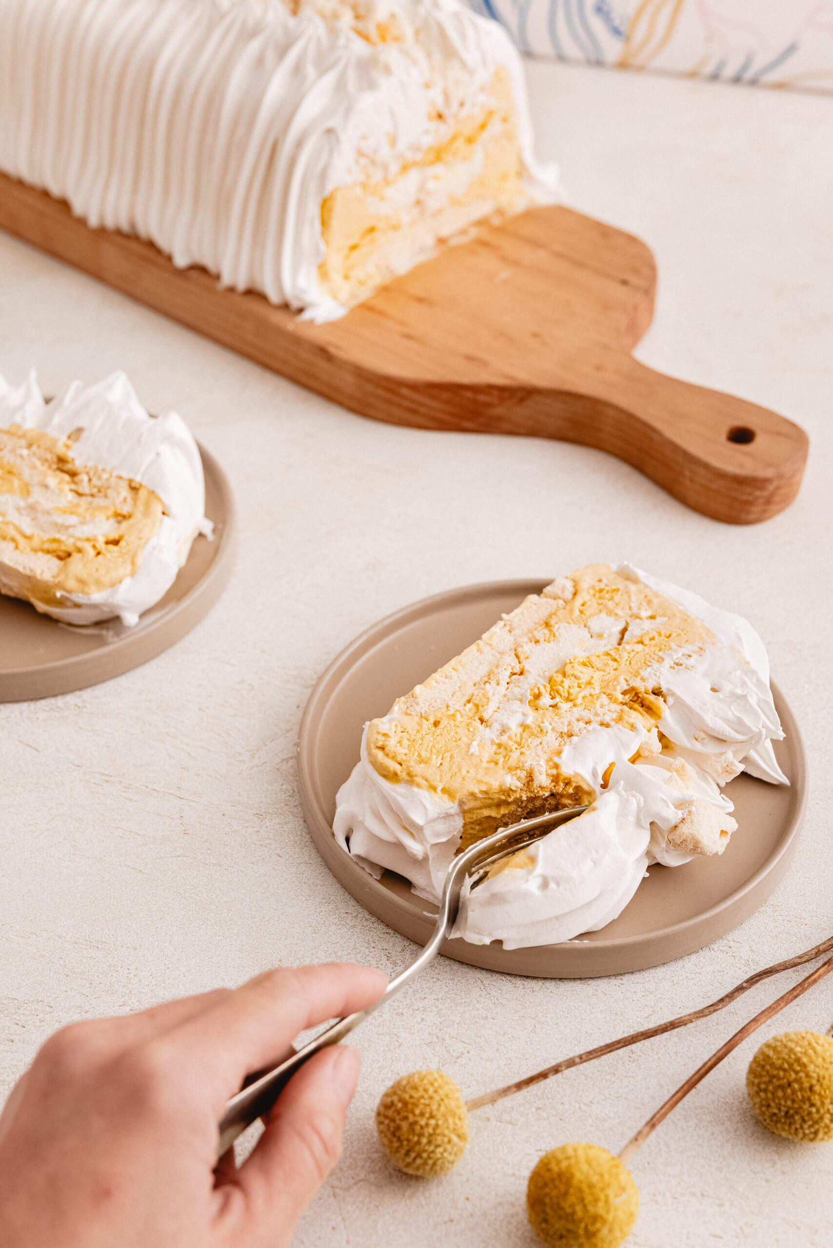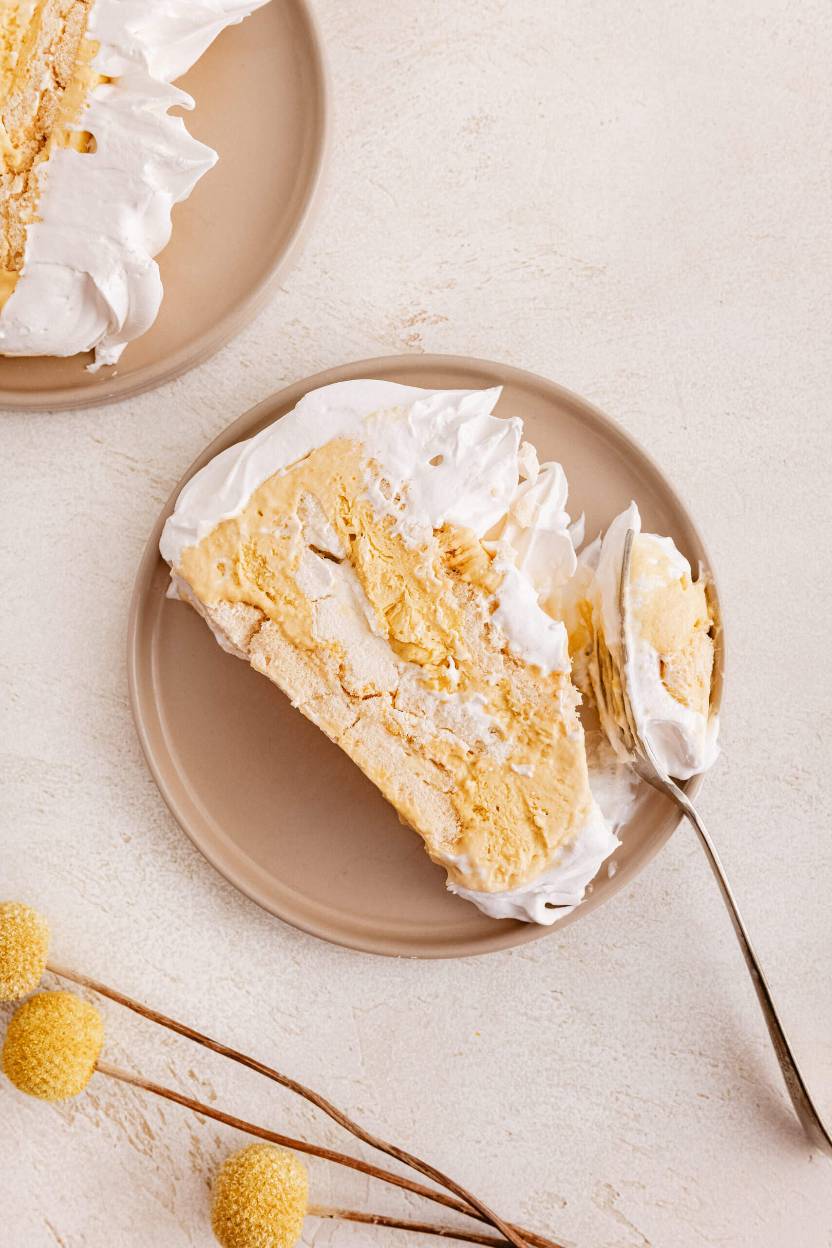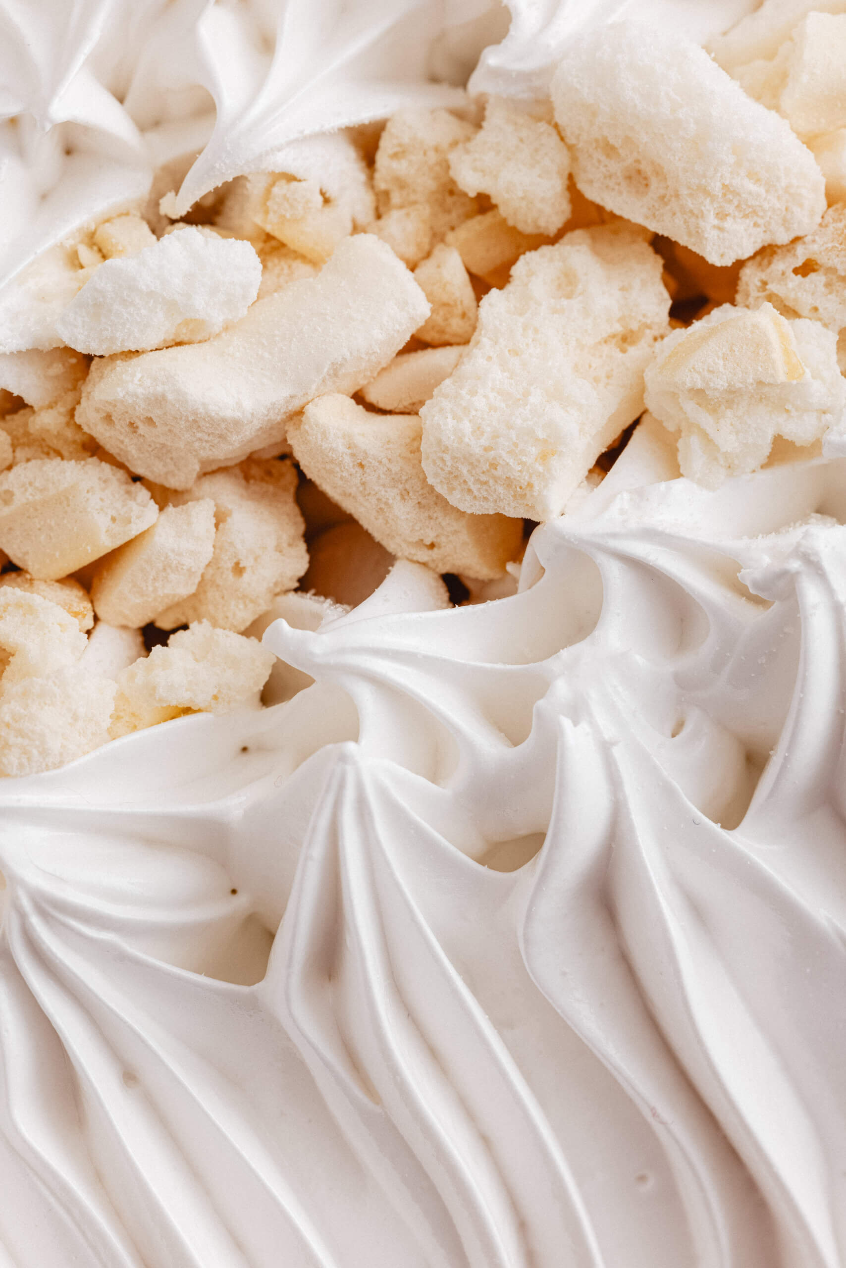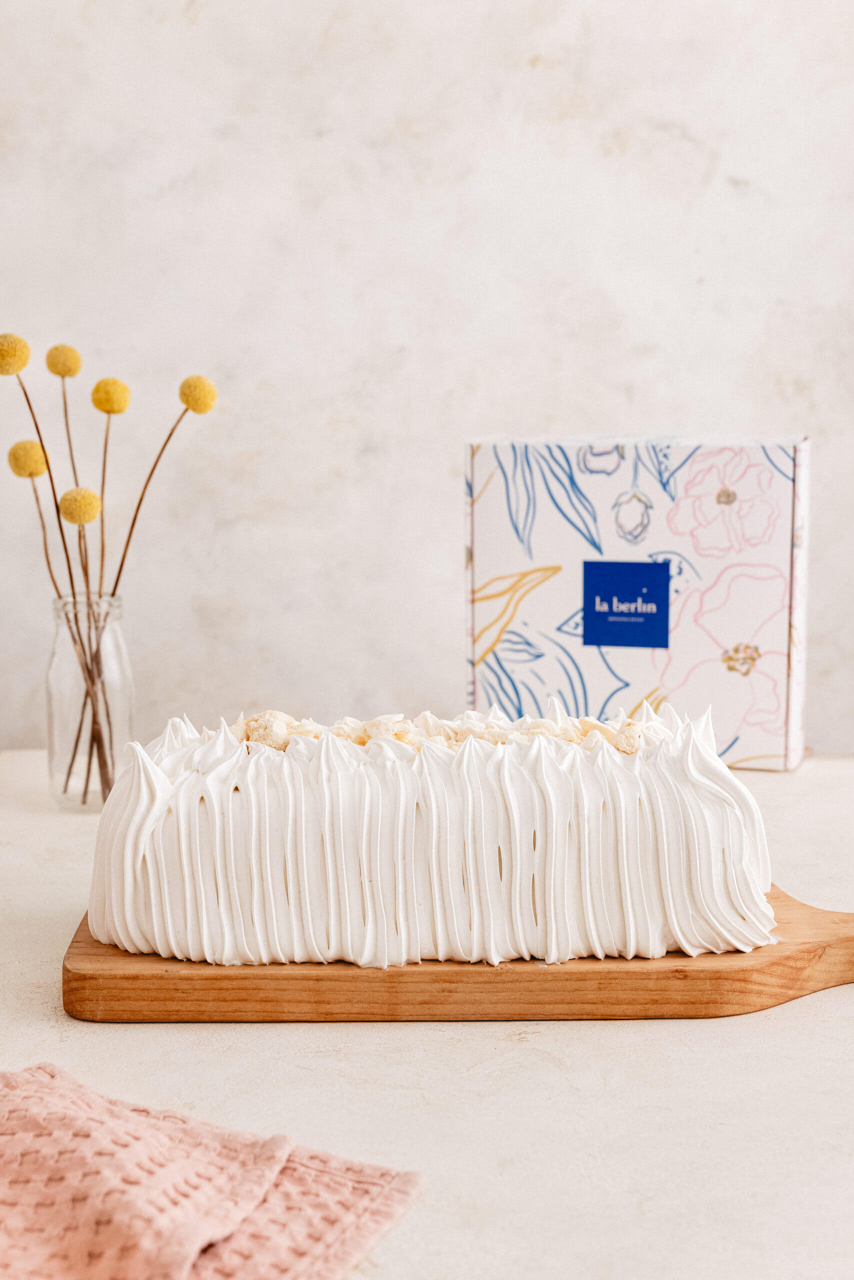 Merengue relleno de crema sin lactosa y pulpa de lúcuma. Decorada con merengue.