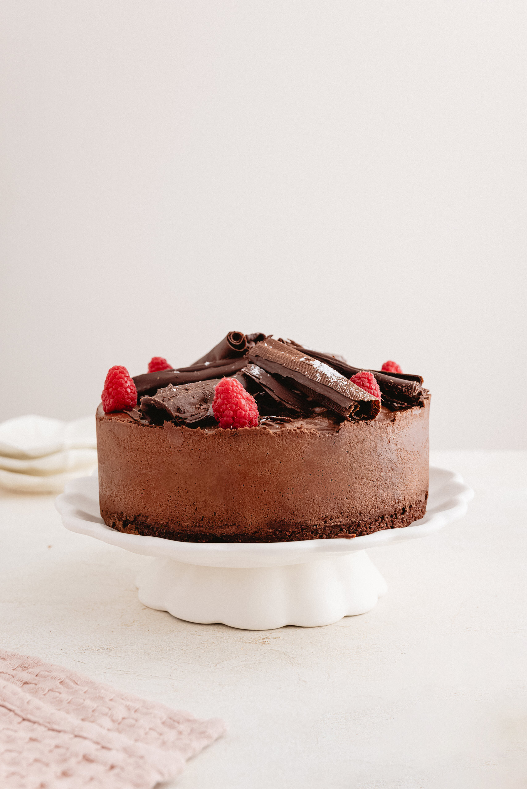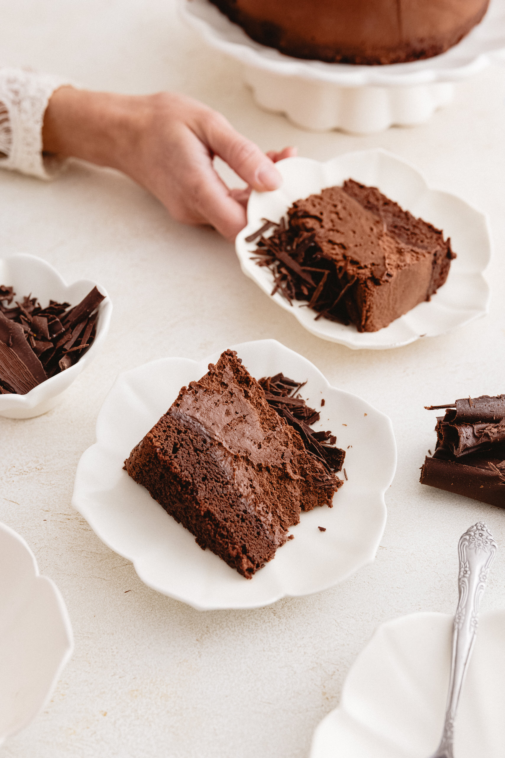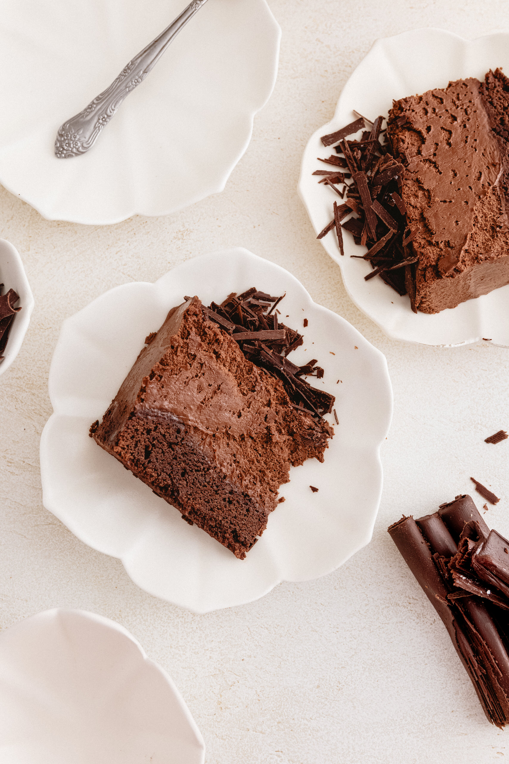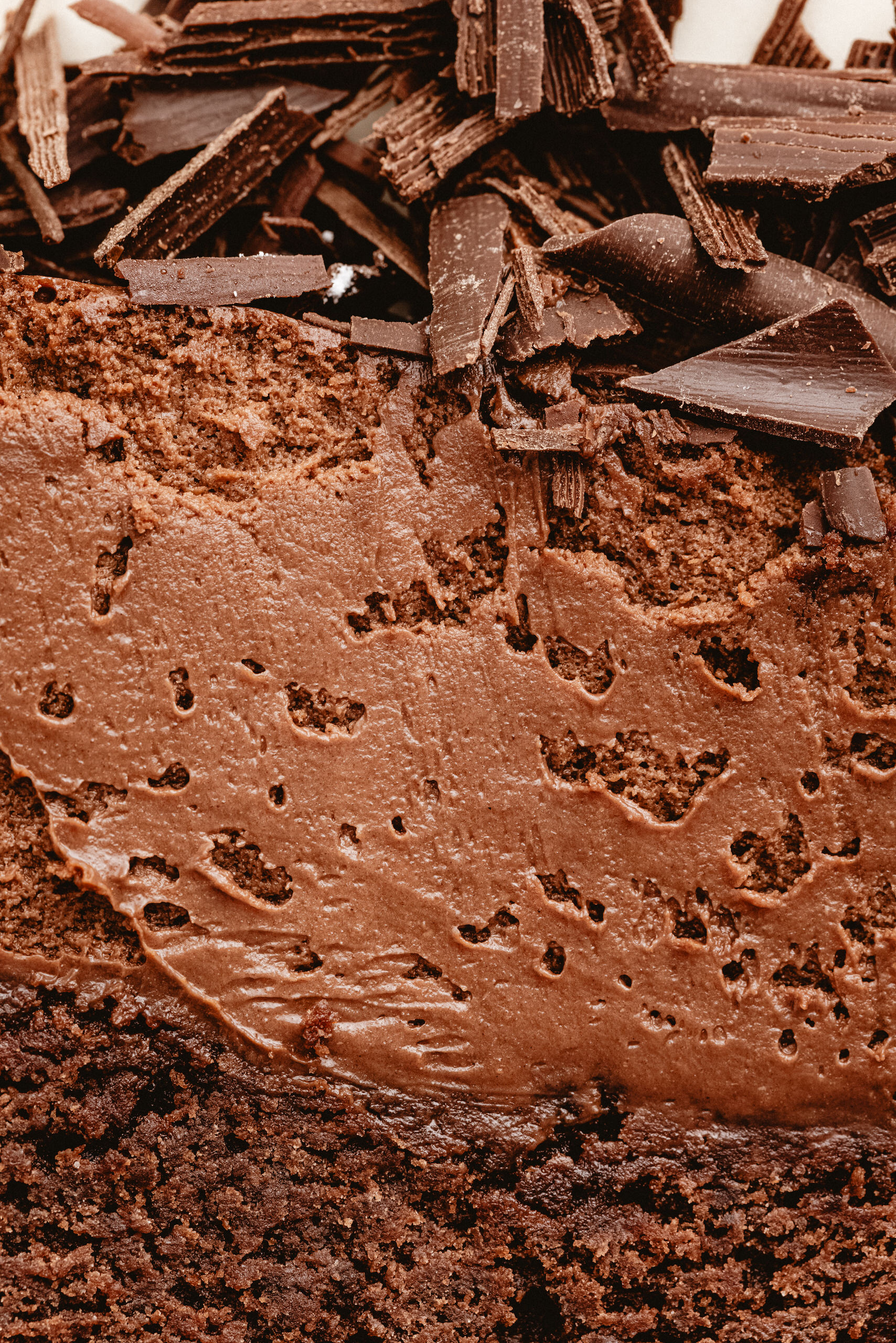 Base de brownie, mousse de chocolate semi amargo. Decorado con chocolate en ramas.